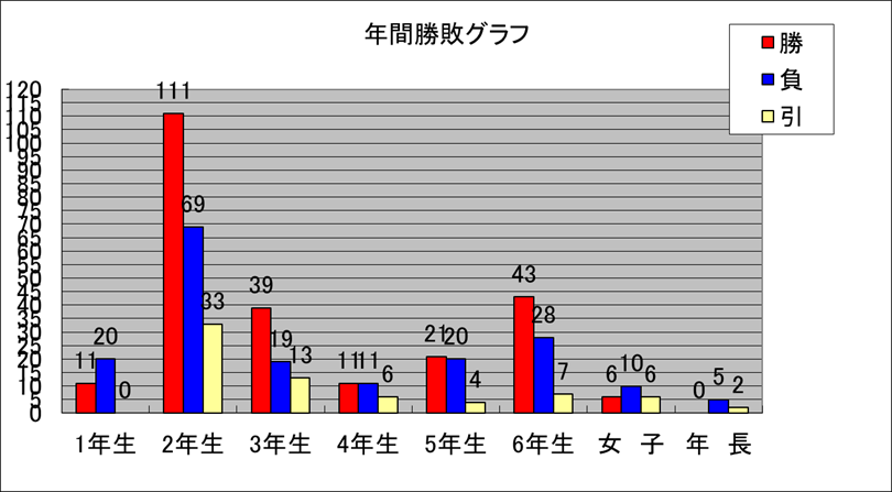 | 6年生 | 78 | 43 | 28 | 7 | 6年生の試合詳細(ここをクリック) | ||